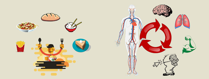 Die Reaktion des Körpers, wenn man Kohlenhydrate zu sich nimmt. Auf dem Bild zu sehen: Brot, Pasta, Reis, Pommes, Kuchen. Mit Hilfe von Insulin speichert der Körper die aufgenommenen Kohlenhydrate als Glucose in Gehirn, Leber, Muskeln und Fettspeicher/Fettpölsterchen.